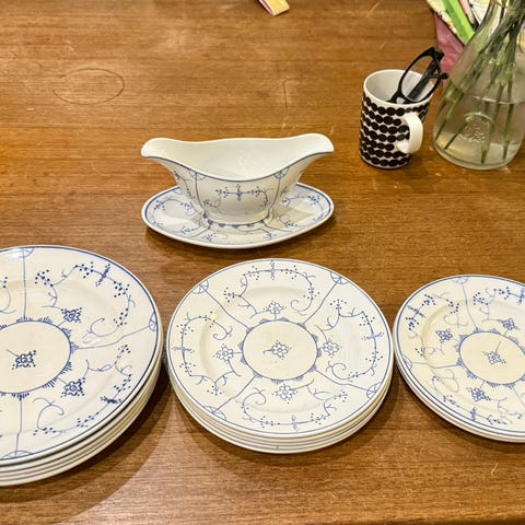 Villeroy Boch Old Luxenbourgh syvät ruokalautaset. Lautaset ovat valkoista posliinia, joissa on sininen kukka- ja ornamenttikuvio sekä kevyesti aaltomainen reuna. Merkitty pohjasta Villeroy & Boch -leimalla. Halkaisija 22,5 cm. Lautasia on 6 kpl. Ei ole montaa kertaa käytetty eli ovat uudenveroisia. Yhteishinta 150 euroa. Nouto Haukkalasta tai postitus toridiilillä.