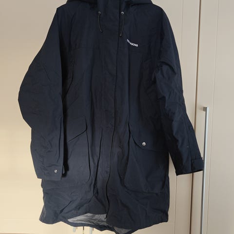 Uusi vedenpitävä, musta koon 48 Didriksons Thelma takki. Takissa laput vielä paikallaan. Kai-kai mitta n. 60cm ja helma n. 70 cm. Vyötäröllä kiristysnyöri. Tilavat taskut. Rintataskuissa sekä nappilistan alla olevassa piilotaskussa vetoketjukiinnitys. Helman taskuissa nepparikiinnitys.