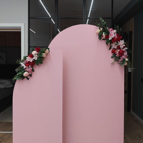 Itse tehty valokuvausseinä, 245 cm korkea ja max 300 cm leveä. Koottu verhoista, valoverhosta, verhotangosta sekä puisista jaloista. Seinä pystytettiin kahteen joulukuusen jalkaan, jotka eivät kuulu kauppaan.