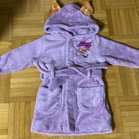 Muumi lasten kylpytakki vetoketjulla, koko 86/92. Kirjava Muumi-kuviointi ja kirjaimia vaalealla pohjalla. Materiaalina puuvilla. Unisex-malli, jossa huppu ja vetoketju edessä.