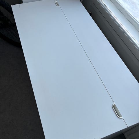 Ikean pöytä. Valkoinen. Hyvä kuntoinen. Korkeus 140 cm, Syvyys 50 cm, leveys 105 cm. Kaksi laatikkoa ja yksi kaappi. Nouto.