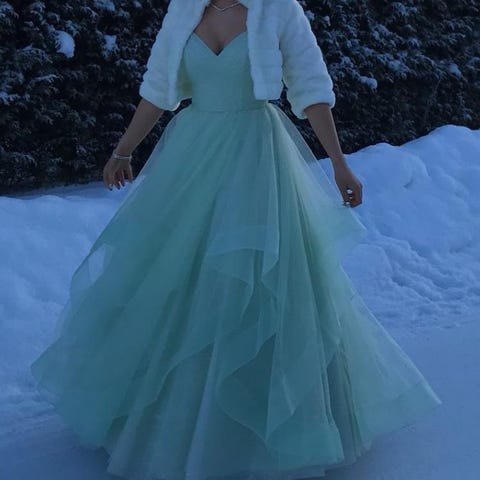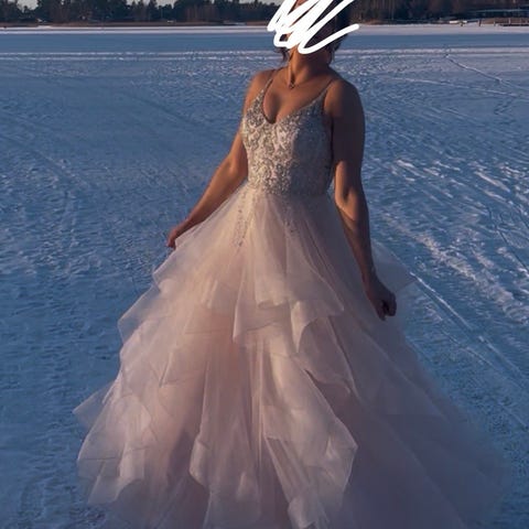 Mekolla on tanssittu yhdet wanhojentassit. Olen itse 170 cm pitkä ja tanssin balleriinoilla. Mekko oli minulle juuri oikean pituinen. Mekko on kokoa 34. Mekkoon on lisätty Zazabellassa off shoulder-osat, jotka ovat samaa kangasta hameen kanssa. Mekossa ei ole juuri käytönjälkiä tai tahroja! Mekosta saa rohkeasti tulla kysymään lisäkysymyksiä ja mekkoa saa tulla sovittamaa.
