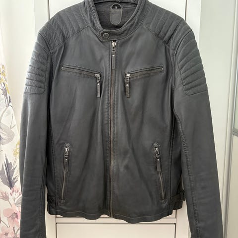 Myynnissä uusi Mauritius merkkinen miesten nahkatakki irrotettavalla hupulla. Väri harmaa. L koko.