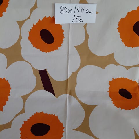 Marimekko Unikko verhokangas, jossa vihreä pohja ja suuret valkoiset kukat keltaisilla keskustoilla. Materiaalina puuvilla. Kankaassa on valmiina verhonauha yläreunassa ripustusta varten. Sopii käytettäväksi verhokankaana tai muuhun sisustuskäyttöön, kuten pöytäliinaksi tai ompeluprojekteihin.