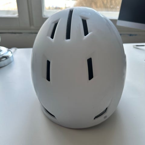 Valkoinen koon M (säädettävä) laskettelukypärä. Kypärässä on säädettävä leukahihna ja pehmustetut korvaosat. Kuoressa on useita ilmanvaihtoaukkoja ja takana pidike esimerkiksi laskettelulasien hihnalle. Pari vuotta sitten ostettu ja alle 10 kertaa käytetty.