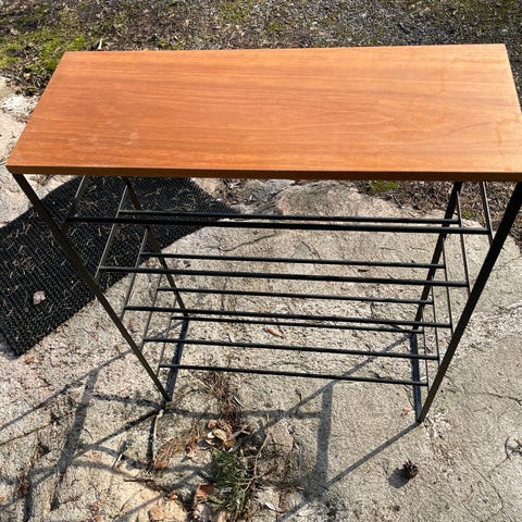 Puinen maalattu valkoinen kenkäteline, nähnyt elämää mutta erittäin vankka