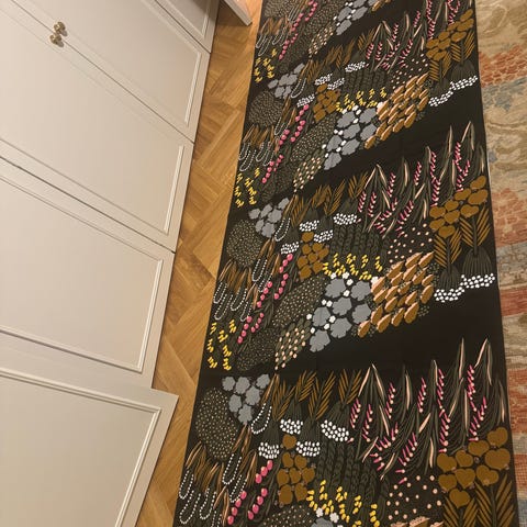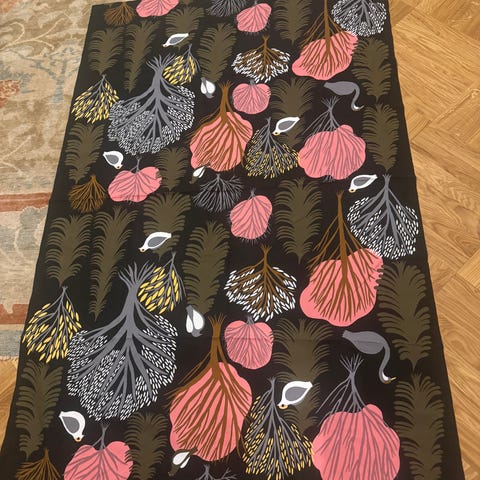 Kaunis, vain kerran käytetty Marimekon ”Kissanminttu” vahakangas pöytäliina.
