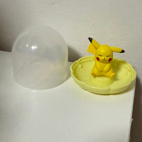 Pokémon Pikachu figuuri ja 3 Pokémon tarraa. Pieni söpö muovinen Pikachu-hahmo vihreällä alustalla.