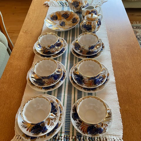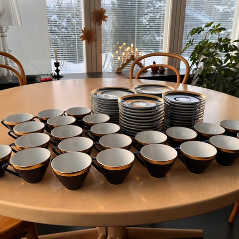 2 teekuppia ja tassit, 14 kahvikuppia, tasseja 12 kpl ja leipälautasia 14 kpl.