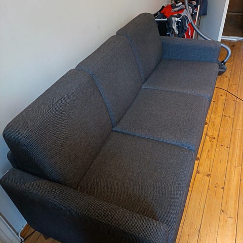 Myydään sohva. Ostettu Askosta n. 15 vuotta sitten. Jouset vähän jo löystyneet, ja kangas paikoin kulunut, mutta edelleen käyttökelpoinen ja yleisilmeeltään siisti. Divaanin kohdalta syvyys 140 cm ja divaaniosa on helposti vaihdettavissa toiseen reunaan. Vain nouto, voin auttaa kantamisessa myyjän päässä. Toivotaan pikaista noutoa uuden sohvan tieltä.