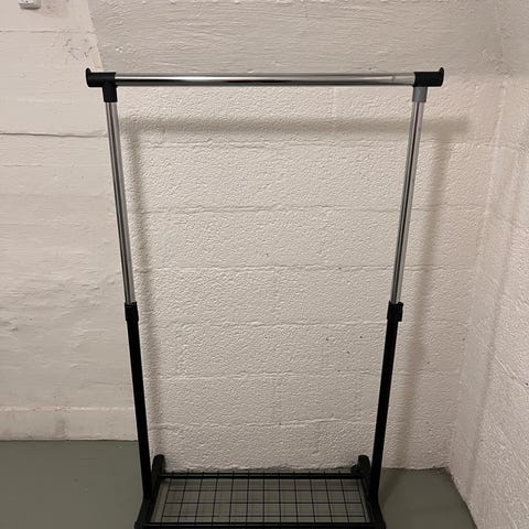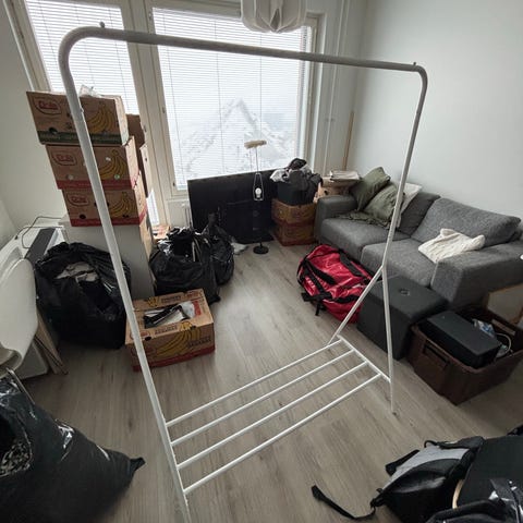 IKEA Rigga vaateteline valkoinen metallinen. Vapaasti seisova teline, jossa yläosassa tanko vaatteiden ripustamiseen ja alaosassa säleikköhylly esimerkiksi kengille tai laatikoille. Telineessä on säätöreiät korkeuden muuttamista varten sekä pyörät helpottamaan siirtämistä. Soveltuu vaatteiden säilytykseen eteisessä, makuuhuoneessa tai vaatehuoneessa.
