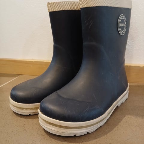 Reima lasten kumisaappaat, koko 26. Väri tummansininen. Saappaissa kuminen alaosa ja tekstiilipäällinen varressa, joka muistuttaa märkäpukukangasta. Pohjissa kuvioitu kumipohja, jossa jo vähän kulumaa. Takana heijastinyksityiskohta. Nouto tai toridiili onnistuu.