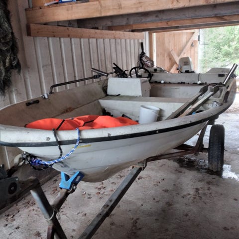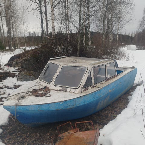 Sekä vene että moottori ovat asiallisessa kunnossa.Paketiin kuuluu:airot,bensiini tankki,kelluntatakki ja kestopuinen teli,jossa vinssi.