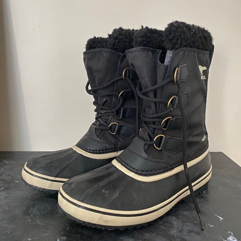 Erinomaisessa kunnossa olevat Sorelin talvisaappaat vedenpitävällä nailonvarrella ja ehjällä ilman halkeamia olevalla kumilla. Virallisesti koko on 43, mutta sanoisin että vastaa ennemmin 44. Nämä ovat todella lämpimät ja huomattavasti kevyemmät kuin esim. Caribou-malli, ja soveltuvatkin täten paremmin liikkumiseen. Kuvissa näkyviä pieniä pinnallisia kosmeettisia käytön jälkiä lukuun ottamatta ovat eivät juuri uudesta häpeä.