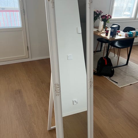 IKEA STAVE kokovartalopeili valkoisella kehyksellä. Peili on kapea ja korkea, sopii esimerkiksi eteiseen tai makuuhuoneeseen. Takapuolella kiinnitysosat seinälle ripustamista varten. Runko ja kehys ovat puukuitulevyä, peilipinta lasia. Väri valkoinen.