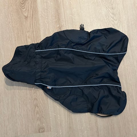 Rukka-merkkinen koiran sadetakki. Niskassa aukko hihnalle.