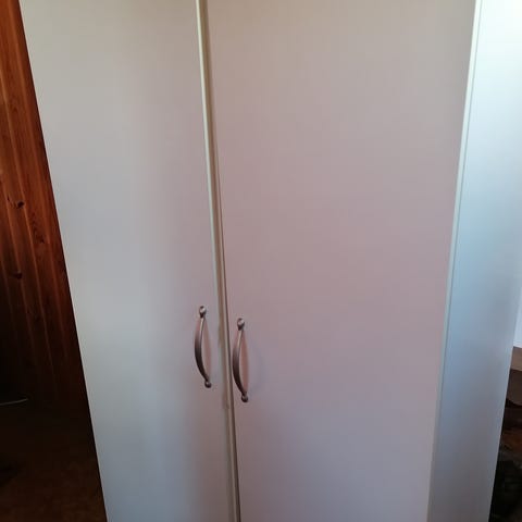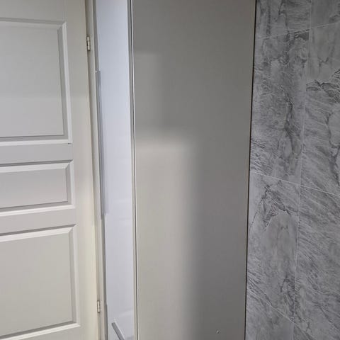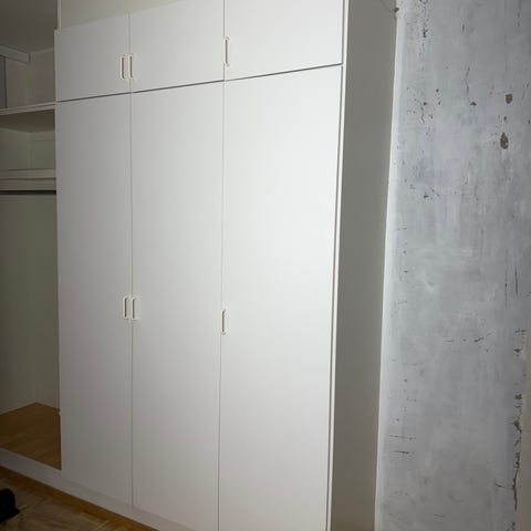 Kerrostaloasunnon takaseinällinen eteisen kaapisto, sisältäen siivouskaapin (lev. 47 cm), jossa paikka mm pölynimurille. Ylinnä yksi iso ja yksi pienempi kaappi.