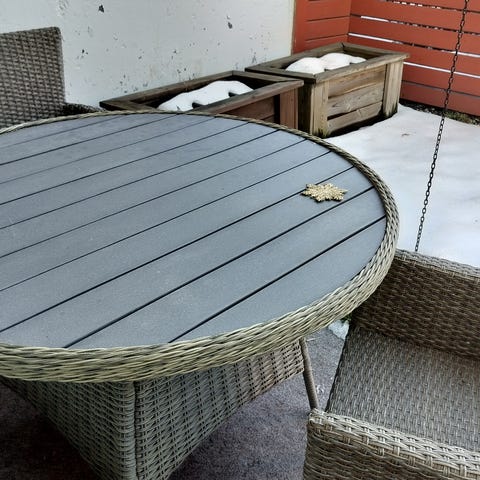 Terassikalusteryhmä, johon kuuluu suorakulmainen pöytä ja neljä tuolia. Materiaalina on ruskea polyrottinki metallirungolla. Pöydässä on säletyylinen kansi ja kapeat jalat. Tuoleissa on korkea selkänoja ja käsinojat, ja ne mahtuvat osittain pöydän alle säilytystä varten. Sopii parvekkeelle, terassille tai pihalle ulkokäyttöön.