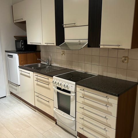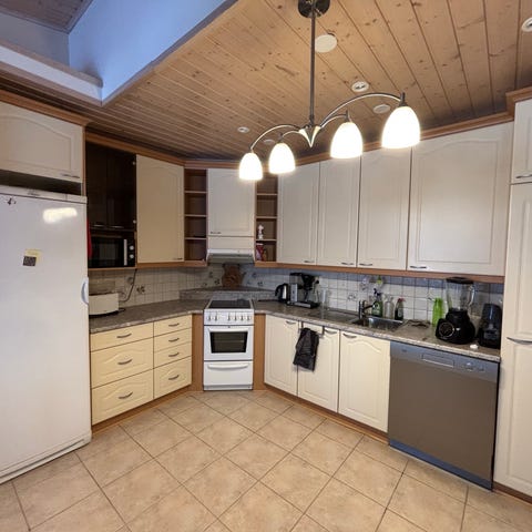 Kuvien keittiökaapisto, valmiiksi purettu. Ovet vahattua massiivitammea. Rungot ja sokkelin etupuolet saatiin ehyenä irti, pari ruuvin jälkeä pääsi jäämään parissa komerossa sisäpuolella sivuille kun asentaja oli vetänyt kannat niin syvään. Runkojen etureunoissa myös tammiviilu. Pöytätasot ja tiskiallas kuuluvat pakettiin myös.