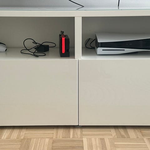 Kompakti Ikean tv-taso, Bestå. Kromatut jalat, laatikoiden ovien pinta korkeakiiltoharmaa, muuten valkoinen. Pari pientä naarmua päällä. Ei tarjous- eikä vaihtokauppa.