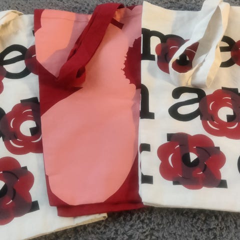 Marimekko kangaskassi unisex. Kassi on valmistettu kankaasta ja siinä on Marimekolle tyypillinen graafinen kuosi, jossa on punaisia kukkia ja suuria mustia kirjaimia vaalealla pohjalla. Pitkät kantohihnat mahdollistavat kantamisen olalla tai kädessä. Sopii arjen ostoskassiksi, kirjakassiksi tai yleiskäyttöön unisex-mallina.