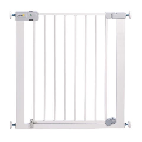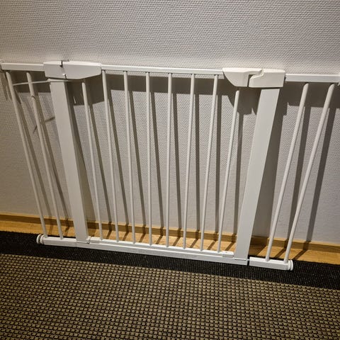 Valkoinen metallinen turvaportti, joka soveltuu esimerkiksi ovenaukkoihin tai käytäville. Portti on valmistettu metallista ja siinä on pystysuuntaiset pinnat. Mukana tulee seinäkiinnitykseen tarvittavia osia, kuten pyöreitä seinäkiinnikkeitä ja ruuveja. Soveltuu käytettäväksi esimerkiksi lasten tai lemmikkien kulun rajoittamiseen sisätiloissa.