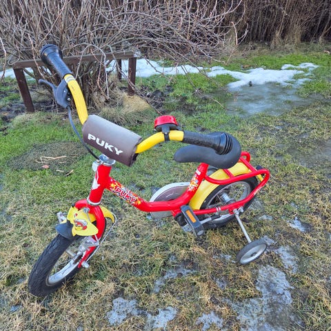 Lasten polkupyörä 12" renkailla. Erittäin paljon ajettu, mutta ehjä ja kaikki toimii. Jalkajarru sekä käsijarru. Pintaruostetta eturenkaan pinnoissa.