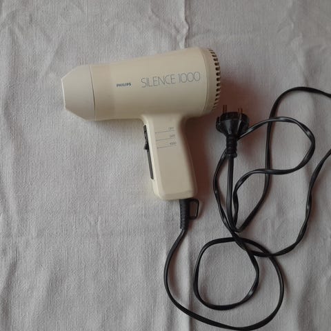 Vuosia palvellut hiusteenkuivaaja uuteen kotiin. Philips Salon Dry, teho 2200W. Kolmeportainen lämmön- ja puhalluksen säätö, kylmäasetus, ionBoost-toiminto.