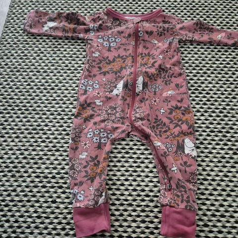 Muumi pyjama koko 68. Hyvä kunto muuten mutta jotkut läikät rinnassa, näkyy kuvassa.