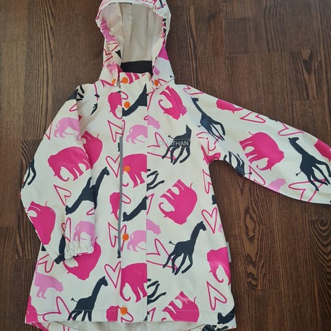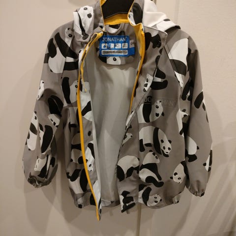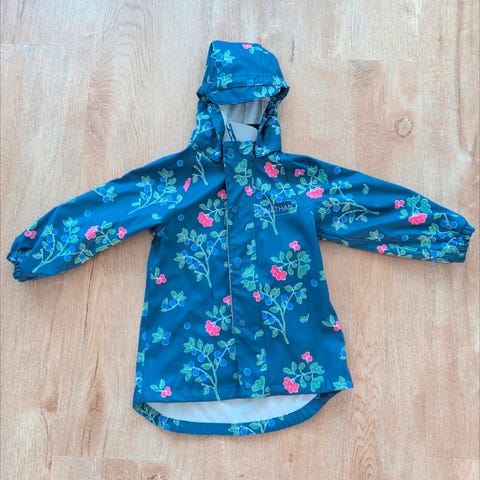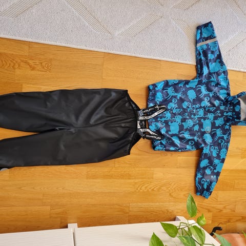 Jonathan sadetakki koossa 104cm ja sadehousut 110cm. Olleet yhdellä käytössä päiväkodissa satunnaisesti.