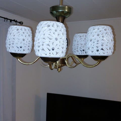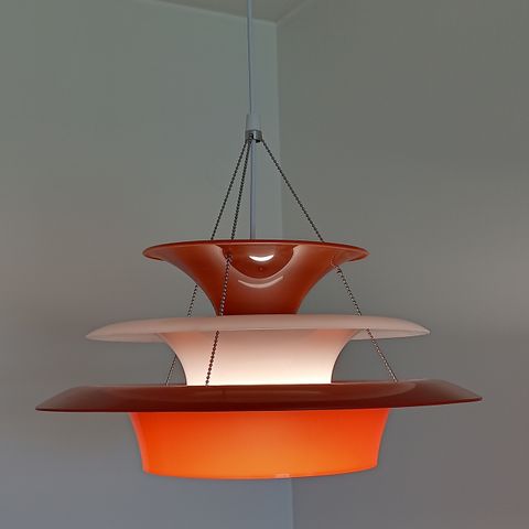 Punainen metallinen riippuvalaisin Coronell 60-70 luvulta.Valkoinen runko ja punaiset ulko osat kuten kuvassa.