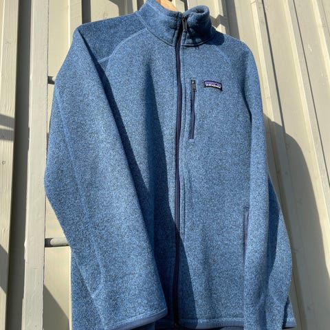 Patagonia miesten takki koossa L. Väri beige, tummansiniset yksityiskohdat. Materiaali polyesteriä. Malli on vetoketjullinen ja siinä on korkea kaulus.