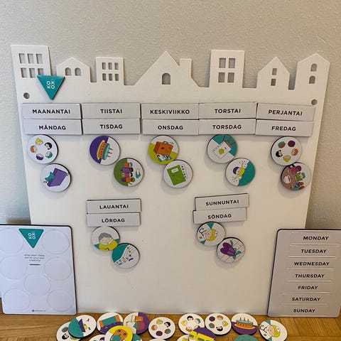 Viikkokalenteri seinälle, magneettitaulu. Kynät hukkuneet, mutta tähän on saatavilla kyniä erikseen ja esim. Valkotaulutussilla voi tähän kirjoittaa.