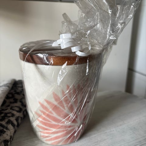 Vihreä säilytyspurkki, jossa irrotettava puukansi. Korkeus 17 cm ja halkaisija 16 cm.