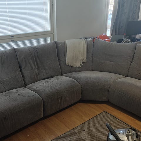 ANNETAAN iso divaanisohva. Tummanharmaa väriltään. Tosi pehmeä ja muhkea istua ja pötkötellä. Kyllä tässä hyvät unetkin saa otettua 😄 muuten ihan siisti, mutta muutamasta kohtaa kangas revennyt istuintyynyissä ja pohjan kangas myös revennyt sivukohdasta. Eipä ne käyttöä ole haitannut, meillekin tullut tämä sohva käytettynä. Imuroin isoimmat pölyt pois.