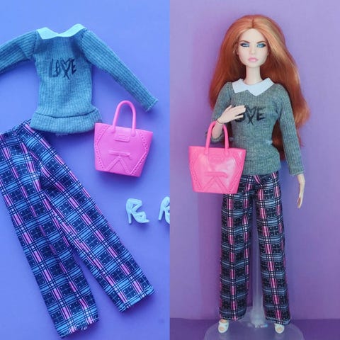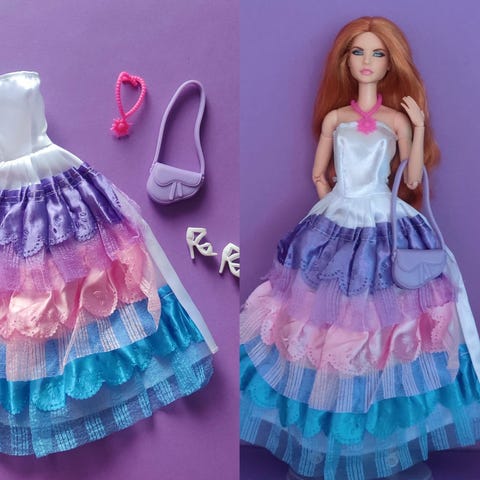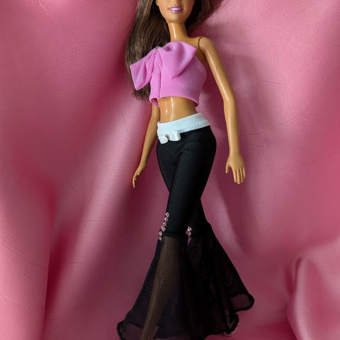 Vaaleanpunainen mekko ja vaal. vihreät toppi ja housut.