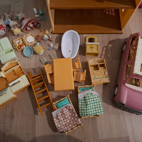 Myydään Sylvanian Families leikkisetti, johon kuuluu pieniä sylvaaneita sekä erilaisia tarvikkeita esim kerrossänky, pinnasänky, liukumäki, ruokapöytä tuoleineen, tarjottimet ja kupit, reppu sekä pieni ajoneuvo. Nouto Lempäälästä tai toridiili. Maksuna käy käteinen tai mobile pay.