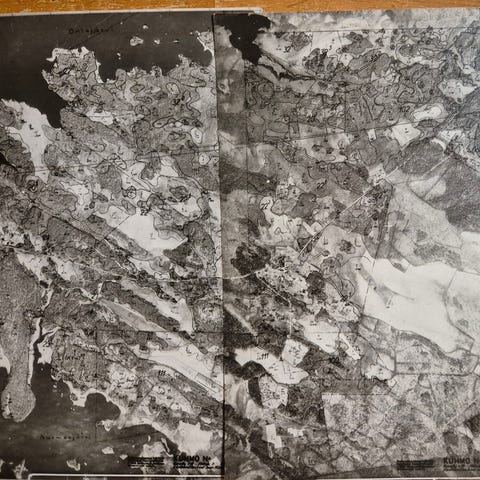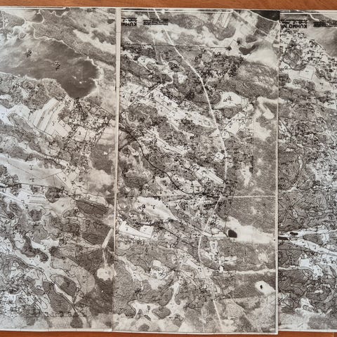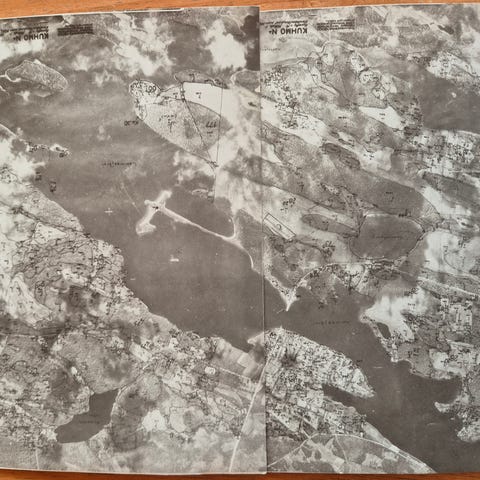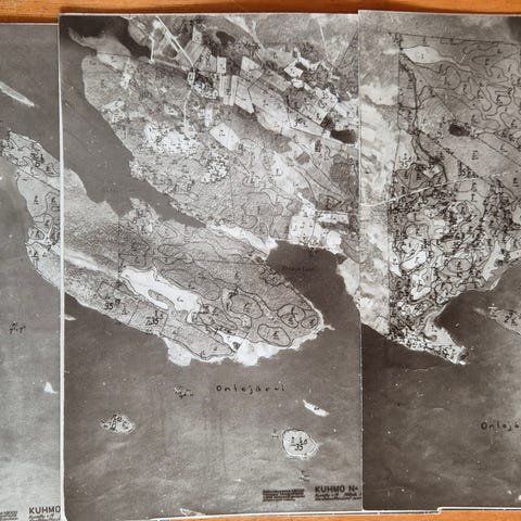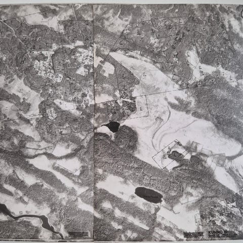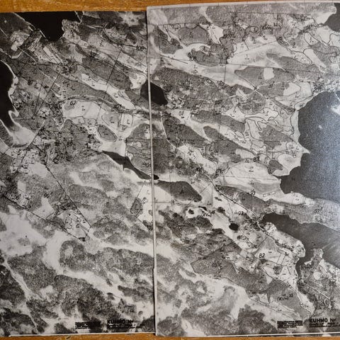 Kaksi osittain päällekkäin menevää ilmavalokuvaa Kuhmon etelä/kaakkoispuolelta, Särkijärven ja Häkkilänniemen välinen alue. Kuvassa vasemmalla Särkijärvi, Kuikkavaaraa sekä Ylä-Salminen. Oikessa yläreunassa Raihionlahtea ja alakulmassa vähän Purnulampea.