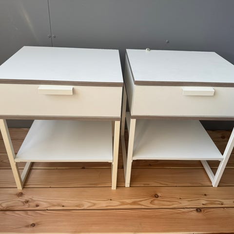 Valkoinen kolmijalkainen yöpöytä tai sohvapöytä. Pöytätasossa pieniä jälkiä. Ehjä ja tukeva.