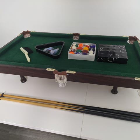 Biljardipöytä taittuvalla jalustalla. Pelipinta on violettia huopaa.