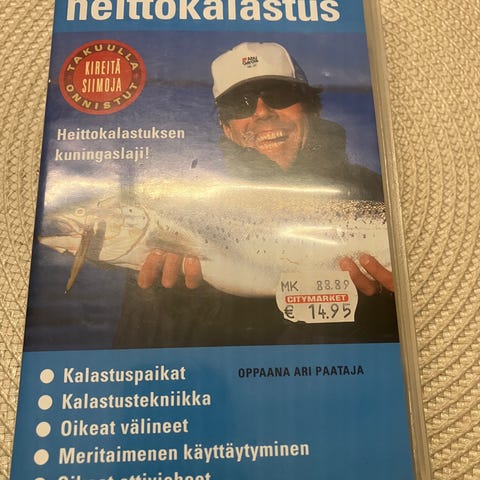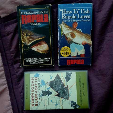 Rapala opasvideo kalastusvideo VHS-kasetilla. Videolla esitellään Rapala-vieheiden käyttöä ja kalastustekniikoita eri kalalajeille. Kasetti on suomenkielinen opas, jossa käydään läpi vieheiden oikea uitto, kalastusmenetelmät ja Rapala-välineiden hyödyntäminen käytännön kalastuksessa.