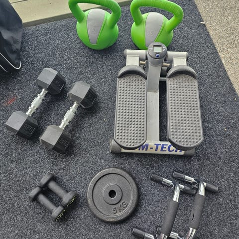 Setti kuntoiluvälineitä. Steppilauta korotusosineen, vastusnauhasetti , jumppapallo , kahvakuula , käsipainot ja nilkka/rannepainot. Suurinta osaa käytetty vain pari kertaa. Yht.40€