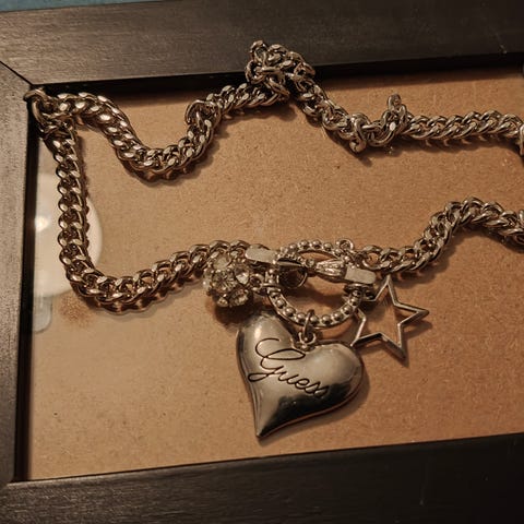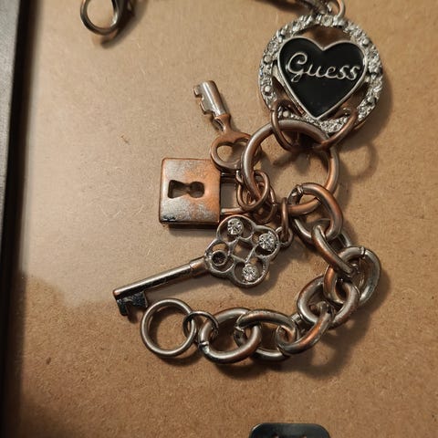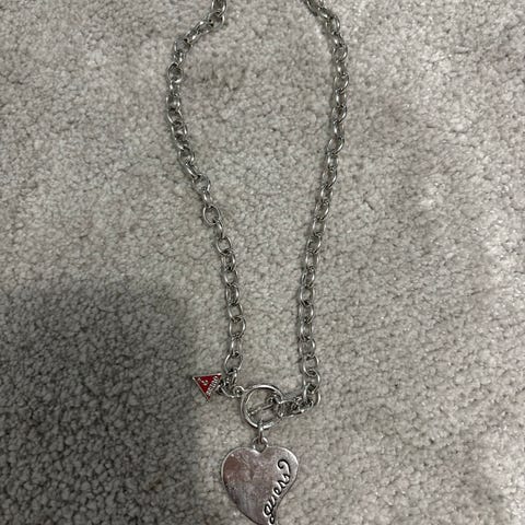 Guess naisten rannekoru, valmistettu teräksestä ja hopeoidusta materiaalista. Ketjumallinen rannekoru, jossa pyöreä riipus.