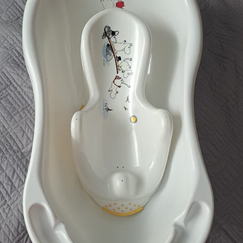Lasten kylpyamme ja kylpytuki, joissa Muumi-kuviointi. Väri valkoinen, koristeena värilliset Muumi-hahmot. Kylpyamme sopii vauvan ja pienen lapsen kylvettämiseen. Kylpytuki asettuu ammeen sisälle ja tukee vauvan asentoa kylvyn aikana. Materiaalina muovi, helppo puhdistaa käytön jälkeen. Soveltuu yleisesti vauvoille ja taaperoille kylpyhetkiin.
