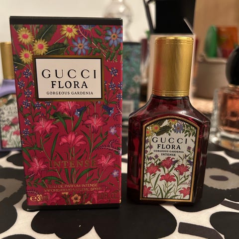 Gucci Flora Gorgeous Gardenia hajuvesi. Eau de Parfum -tuoksu naisille. Pullon koko 50 ml. Vaaleanpunainen lasipullo kultaisella korkilla ja kukkakuvioidulla etiketillä. Mukana alkuperäinen kukkakuvioitu myyntipakkaus, josta löytyvät tarkemmat ainesosa- ja käyttömerkinnät. Ostettu marraskuussa, käytetty yhteensä ainoastaan n. 7 kertaa, eli on käytännössä täysi pullo. Pakkauksessa ja pullossa ei mitään käytön jälkiä.