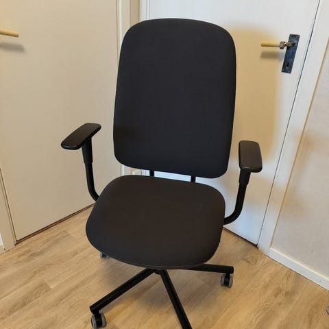 Tuoli on hyvässä kunnossa ja toimii moitteettomasti. Pyörät liikkuvat hyvin ja tuoli pyörii normaalisti.