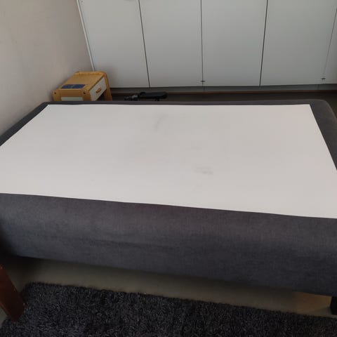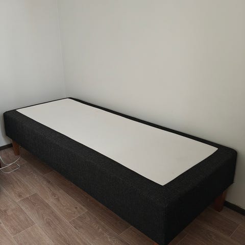 Sängyn runko, johon kuuluu neljä irrotettavaa puujalkaa. Rungon verhoilu on vaaleasävyinen kangas. Sopii käytettäväksi esimerkiksi joustin- tai vaahtomuovipatjan kanssa. Jalat kiinnitetään runkoon kierretangoilla.
