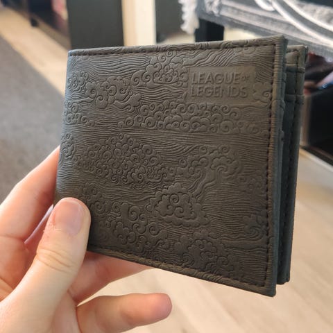 Tekonahkainen musta LoL-teemainen bifold-lompsa kultaisilla/oranssilla painatuksilla. Kuvissa Runeterran kartta ja pelin logo. Sisällä kolikkotasku ja paikat korteilla. Uusi, ei käytetty.