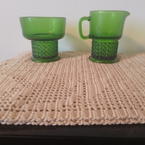1960-luvun kermakko ja sokerikko vihreää lasia. Kermakossa tarra Kumela Riihimäki.
