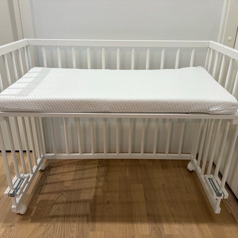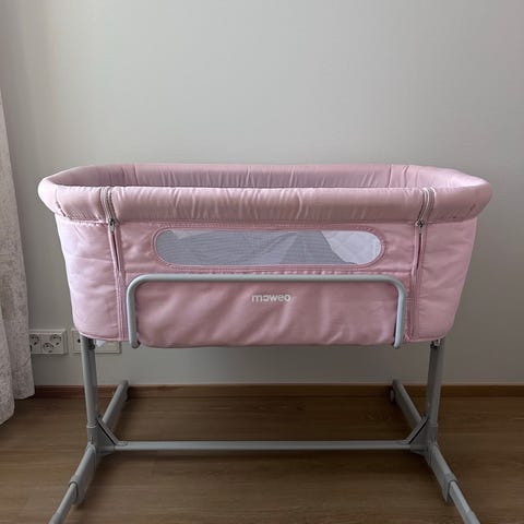 Petite & Mars sivuvaunusänky. Hengittävä valkoinen verkkokangas kiertää koko sängyn, vauvan näkee näin myös paremmin. Runkoa saa eri korkeuksille. Sängyn saa kiinnitettyä aikuisten sänkyyn, toimii näin halutessa myös sivuvaunusänkynä. Jaloissa lukittavat pyörät. Toisesta laidasta saa laitaa alemmas, helpompi antaa tuttia jne., näkyy kuvassa. Irrotettavat päälliset. Patjassa turvallinen pohja, jossa myös irrotettava pesty päällinen. Keinutoiminto, mutta emme käyttäneet. Yhdellä vauvalla ollut n. 8kk asti käytössä. Suositusikä taitaa olla n. 6kk. Mukana ohjekirja ja säilytyspussi.